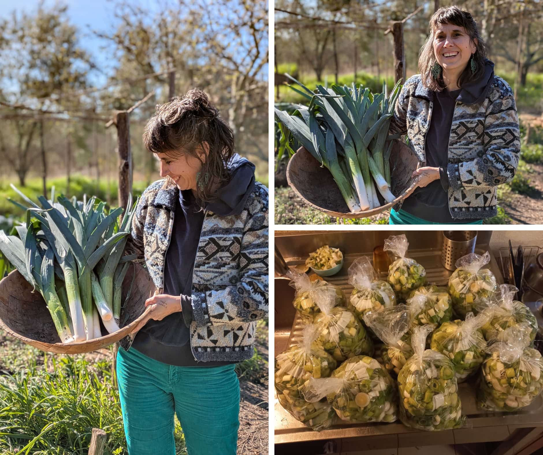 On se dépêche de récolter les derniers poireaux repiqués en juillet dernier. Certains commencent déjà à monter à fleurs, il est temps de les consommer. Il nous en reste largement assez par rapport notre auto-consommation, on en profite pour faire des stocks pour l’année !