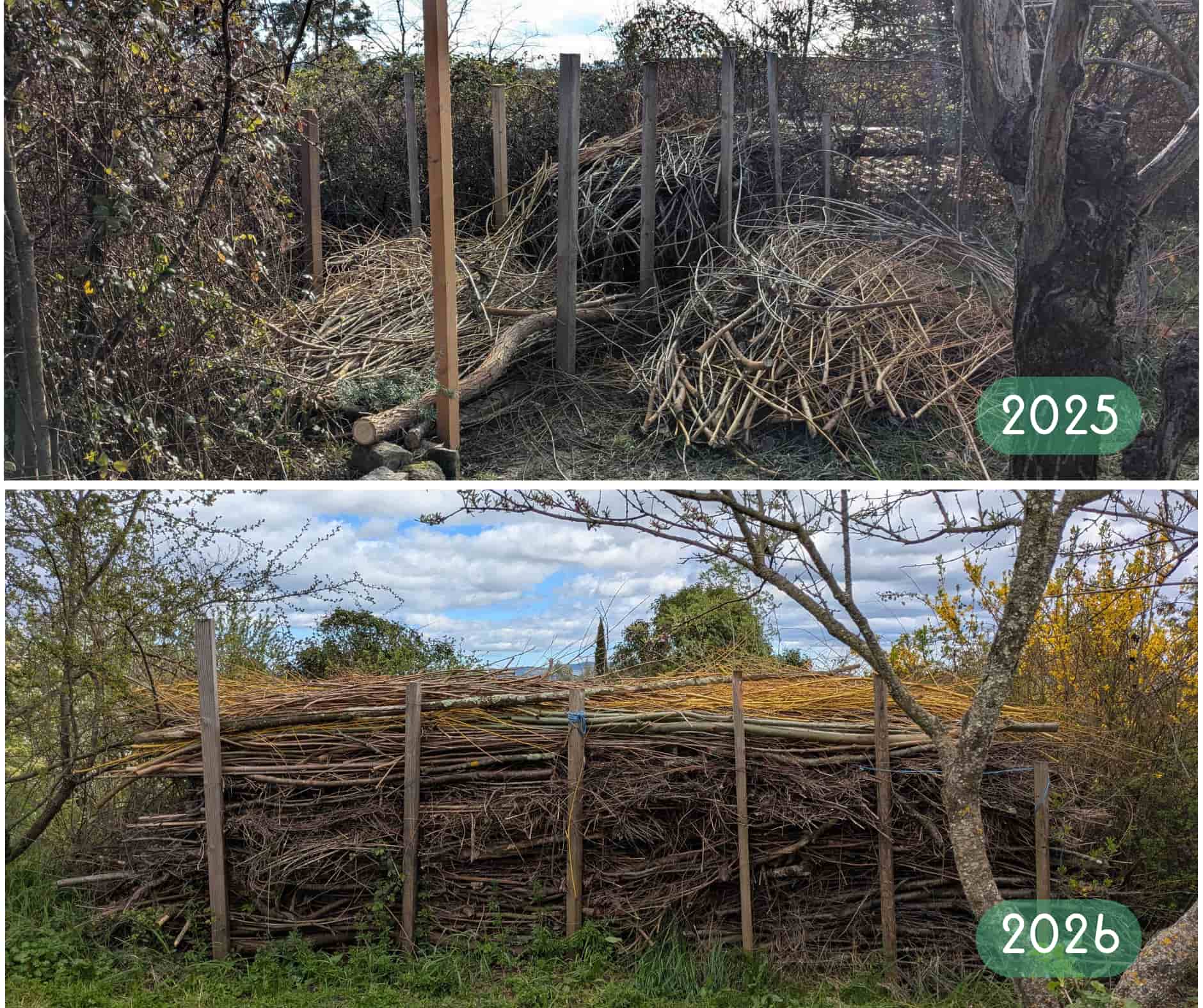 Moins d’une année après sa réalisation, l’une des trois haies sèches des jardins est bien remplie. Entre l’entretien des fruitiers, la taille des haies et des trognes ou encore des ronciers, près de 10m3 de bois sont accumulés depuis 2 années dans cette haie “morte”. La décomposition du bois dans cette configuration est lente, mais présente beaucoup d’avantages pour nos jardins :