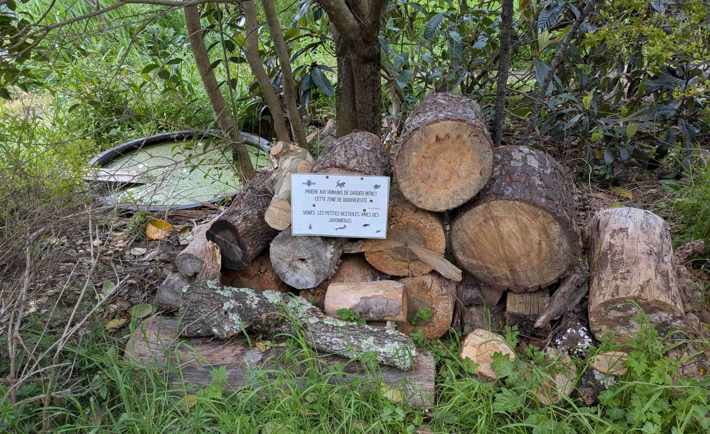 La haie centrale du Verger-Potager s’est améliorée cette année, en plus du point d’eau qui abrite grenouilles et autres libellules, nous y avons intégré un tas de bois. C’est un petit aménagement hospitalier à la faune sauvage de plus, facile à réaliser et efficace pour favoriser les auxiliaires des jardins.
