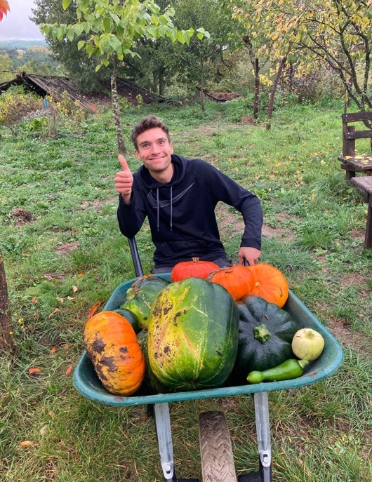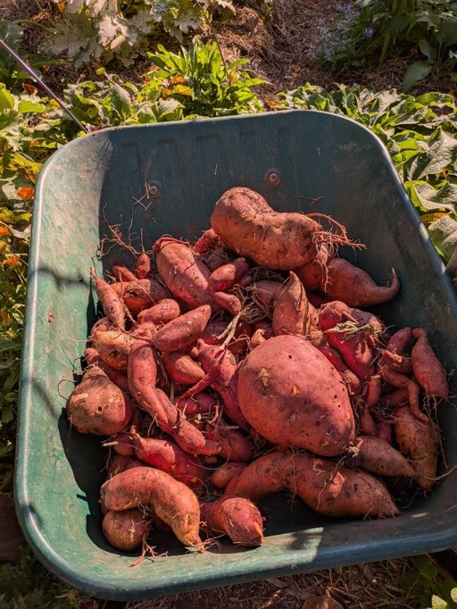 Nous finissons aussi de récolter les patates douces. Malheureusement, les récoltes n’ont pas été fameuses car nous les avons plantées tard. La patate douce est une plante avec un développement long et c’est sur les dernières semaines, avant les premières gelées, que les tubercules grossissent le plus. Nous sommes aussi en train de finir la récolte des courges : déjà 180 kg et encore une centaine à venir !