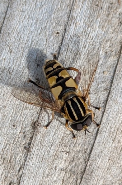 Ce mois-ci nous vous présentons l’Hélophile Suspendu, rencontré dans nos jardins au niveau d’une de nos mares. C’est une mouche (diptère) d’environ 12 mm, de la famille des syrphes. Au stade adulte, c’est un pollinisateur qui se nourrit de pollen et nectar. De son côté, la larve se développe dans les zones humides, comme une mare où elle se nourrit dans la vase.